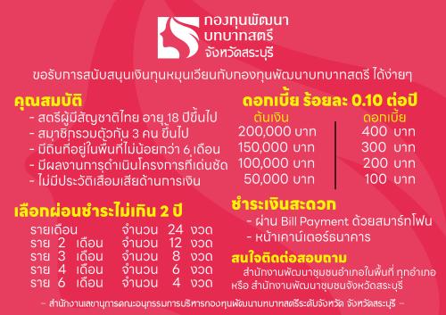 นางสาวพิมพ์ชนา พิชาพันธ์โภคิน พัฒนาการอำเภอดอนพุด พร้อมด้วยเจ้าหน้าที่พัฒนาชุมชน ประชาสัมพันธ์การขอรับการสนับสนุนเงินทุนหมุนเวียน (เงินกู้) ดอกเบี้ยต่ำ จากกองทุนพัฒนาบทบาทสตรี เพื่อนำไปใช้เป็นทุนในการประกอบอาชีพ เสริมรายได้ และยกระดับคุณภาพชีวิตของสตรีในชุมชน โดยมีคุณสมบัติ ดังนี้